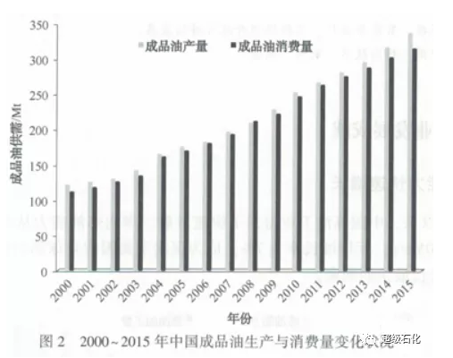 2015年,中國煉廠原油加工量為522Mt,生產(chǎn)成品油38Mt,其中汽油121.04Mt,煤油36.59Mt、柴油180.08Mt;成品油消費量為315Mt.其中汽油114.33Mt、煤油27.44Mt、柴油173.05M。2015年成品油出口25.44Mt.進(jìn)口4.08Mt.