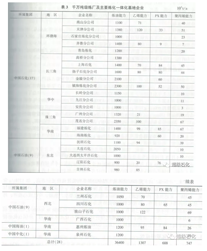 官芳則芳”的煉油理念,使寶貴的石油資源得到合理優(yōu)化利用同時,集中綜合利用煉廠和石化裝置的各種產(chǎn)品和中間產(chǎn)物,方便原料和產(chǎn)品的集中進(jìn)出,提升設(shè)施共享水平,減少水、電、汽、熱、風(fēng)等公用工程系統(tǒng)的投資和費用,提高經(jīng)濟(jì)效益。中國煉油工業(yè)依托萬噸級大型煉廠的建設(shè),結(jié)合大型乙烯工程的新建或改擴(kuò)建,已經(jīng)形成了一批大型煉化一體化基地企業(yè),明顯提升煉油業(yè)務(wù)的競爭力、如表3所示。